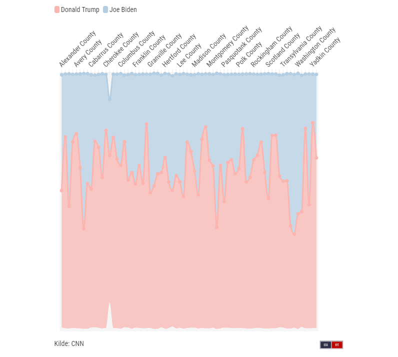 70 ud af North Carolinas 100 amter er at betragte som landlige. Donald Trump vandt 59 ud af de 70 i 2020. Grafik: Alexander de Summer-Brason Welford