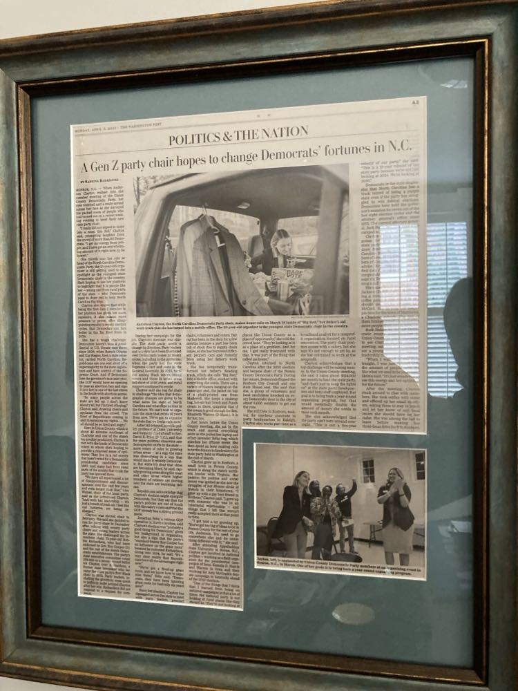 Anderson Claytons kontor er lige så umiddelbart indrettet, som hun selv er. Frisk fra fad har hun trodset dagen derpå, for som formand for Det Demokratiske Parti i North Carolina er det efterhånden sparsomt med fridage. Selv i juleferien.
